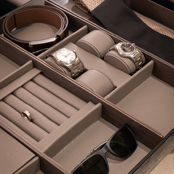 Beautifully proportioned glovebox trays which can accommodate a selection of storage The Milan Drawer Accessories collection has been designed to beautifully organise and protect your most precious items. Each impeccably proportioned glovebox tray offers dedicated compartments for pieces that require extra care and considered storage.